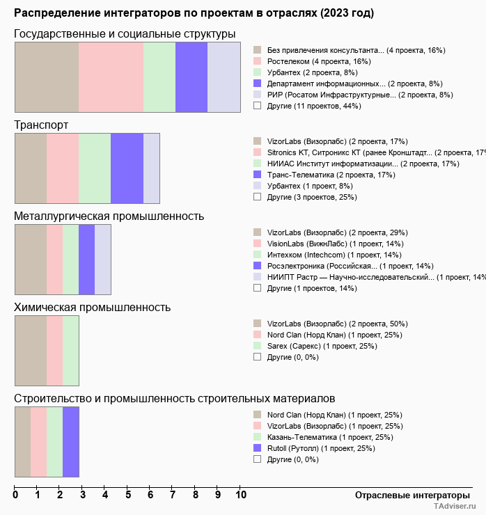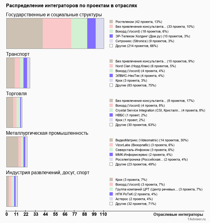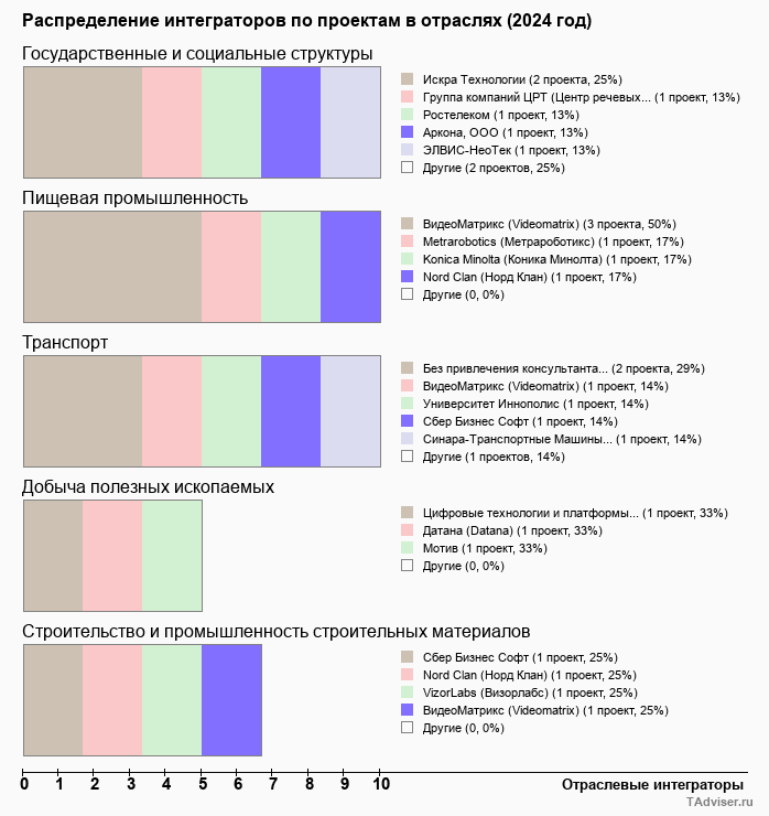 Отраслевое распределение по количеству проектов внедрений