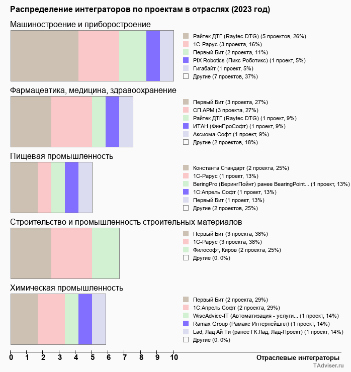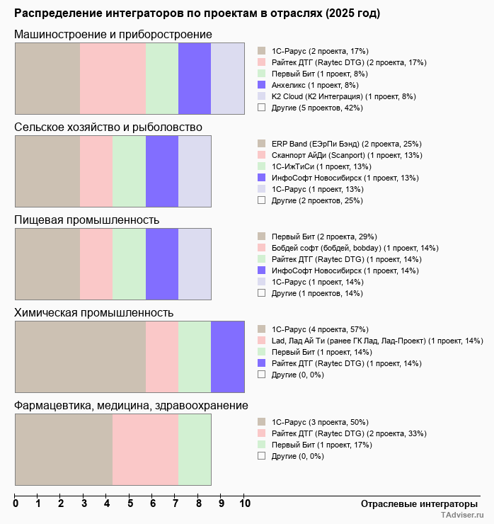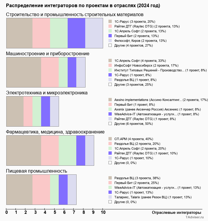За последние 3 года, согласно данным базы TAdviser, чаще всего ERP-системы внедрялись в машиностроении, медицине, строительстве и компаниях пищевой промышленности. За 2022-2024 годы TAdviser собрал информацию о более 320 проектах внедрения таких систем. Всего же за период наблюдения с 2005 года издание систематизировало информацию о более чем 10000 таких проектов.