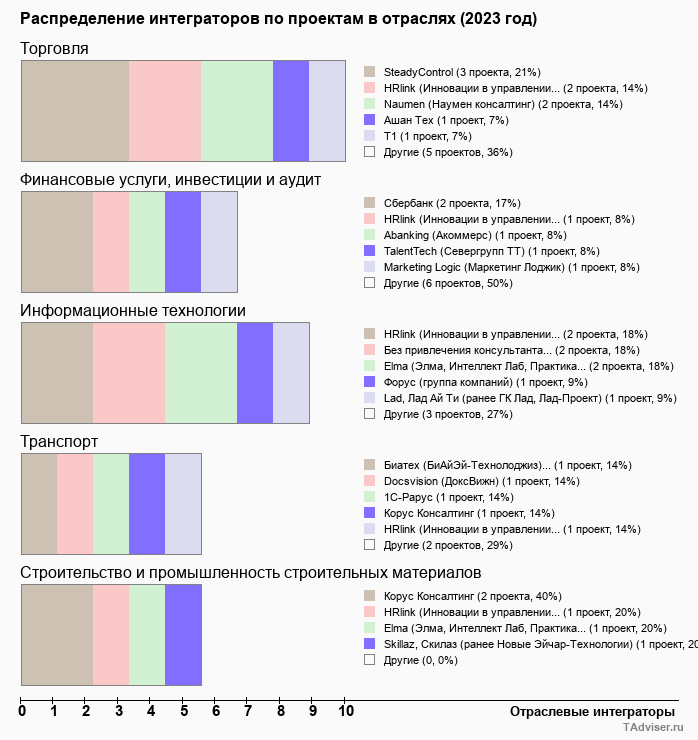 В базе проектов TAdviser содержится информация о более 800 проектов внедрения HR-систем, реализованных за период с 2023 по 2025 год. Чаще всего такие решения внедрялись в 6 отраслях - строительство, ИТ, сфера финансовых услуг, торговля, госсектор и образование.