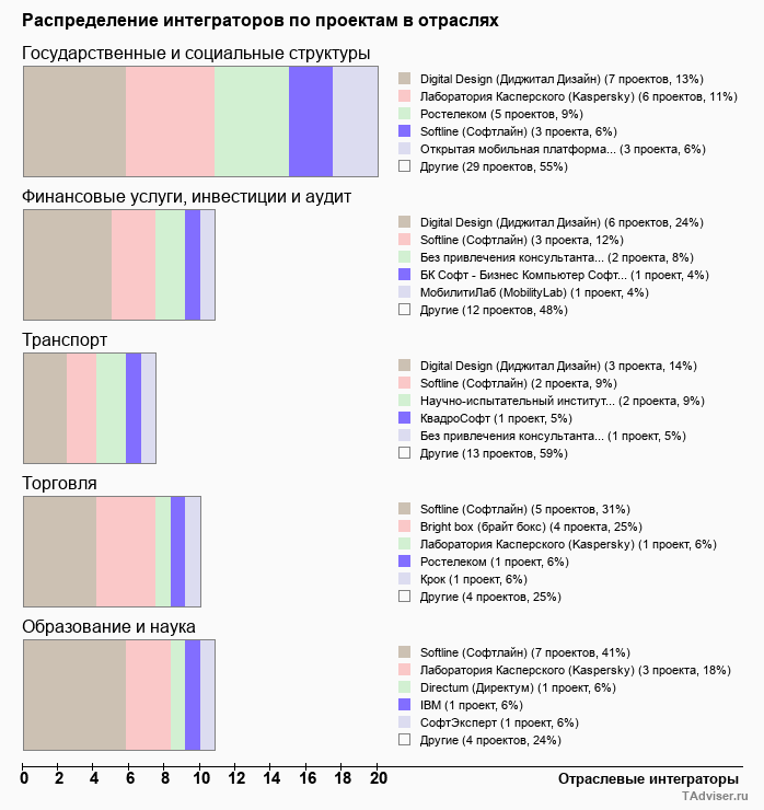 Отраслевое распределение по количеству проектов внедрений